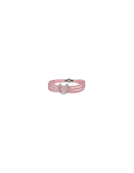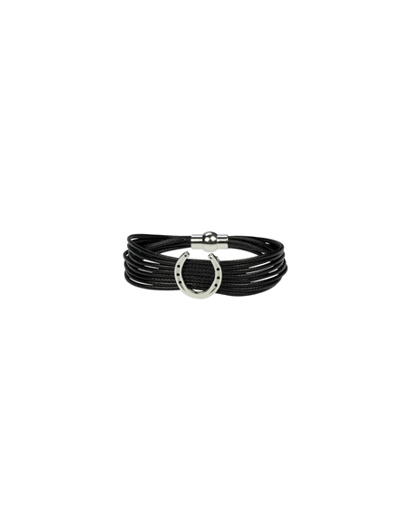 This modern bracelet is held securely on your wrist by a high class magnetic clasp. The small movable horseshoe cast in metal adorns the black cord and makes the bracelet a unique piece of jewelry.