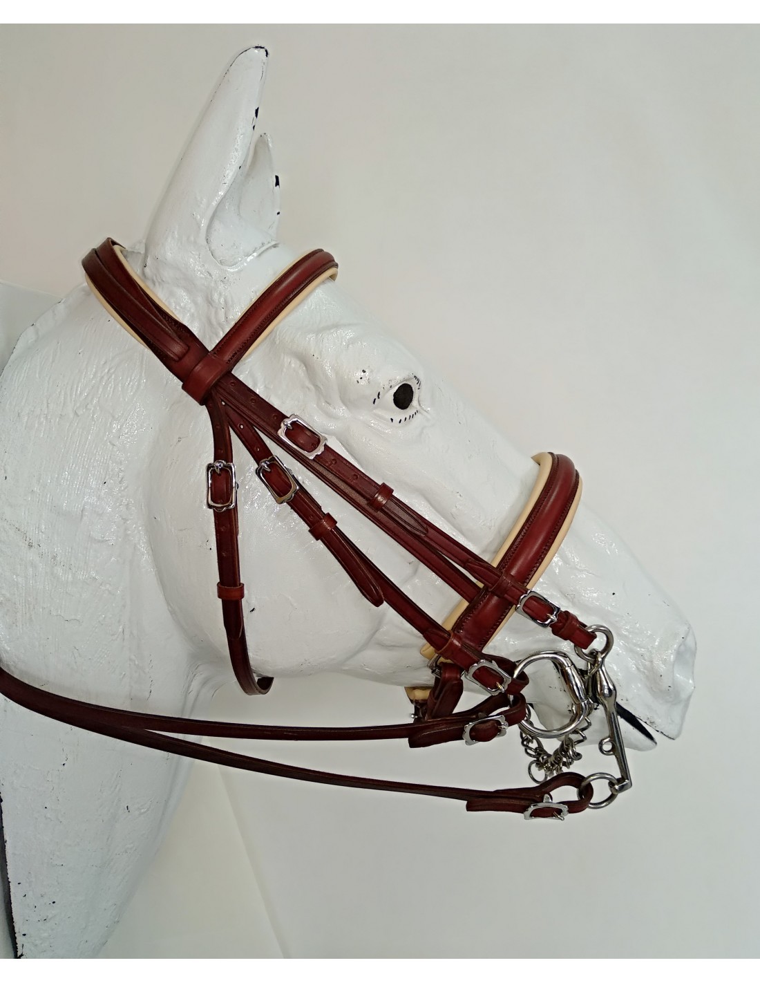 Cabeçada de fabrico 100% Português.Focinheira de ensino almofadada. Couro de 15mm de largura.