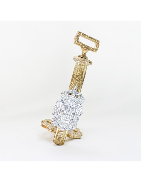 Estribo dourado com brasão cromado. Vendido por pares.