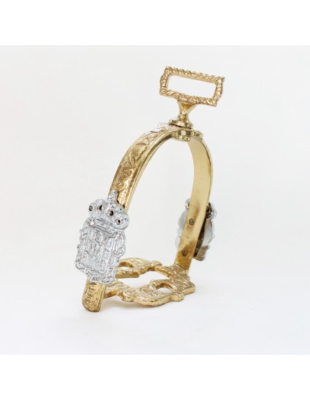 Estribo dourado com brazão cromado. Vendido em pares.